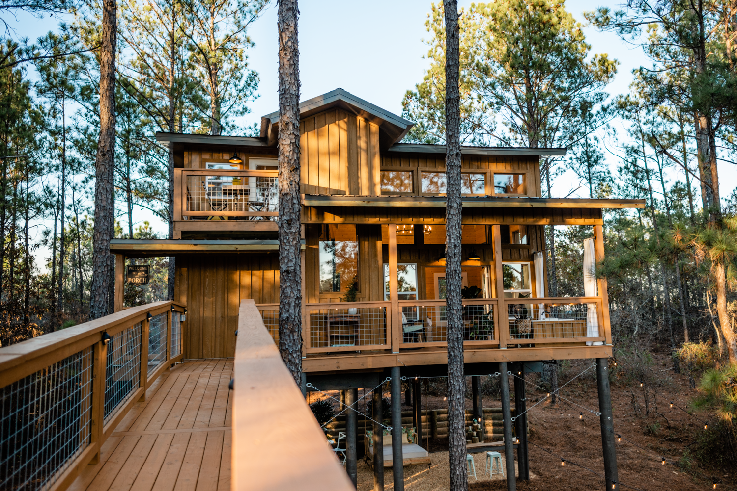 “A custom treehouse suspended 20 feet in the Georgia pines, where modern comfort meets forest canopy”