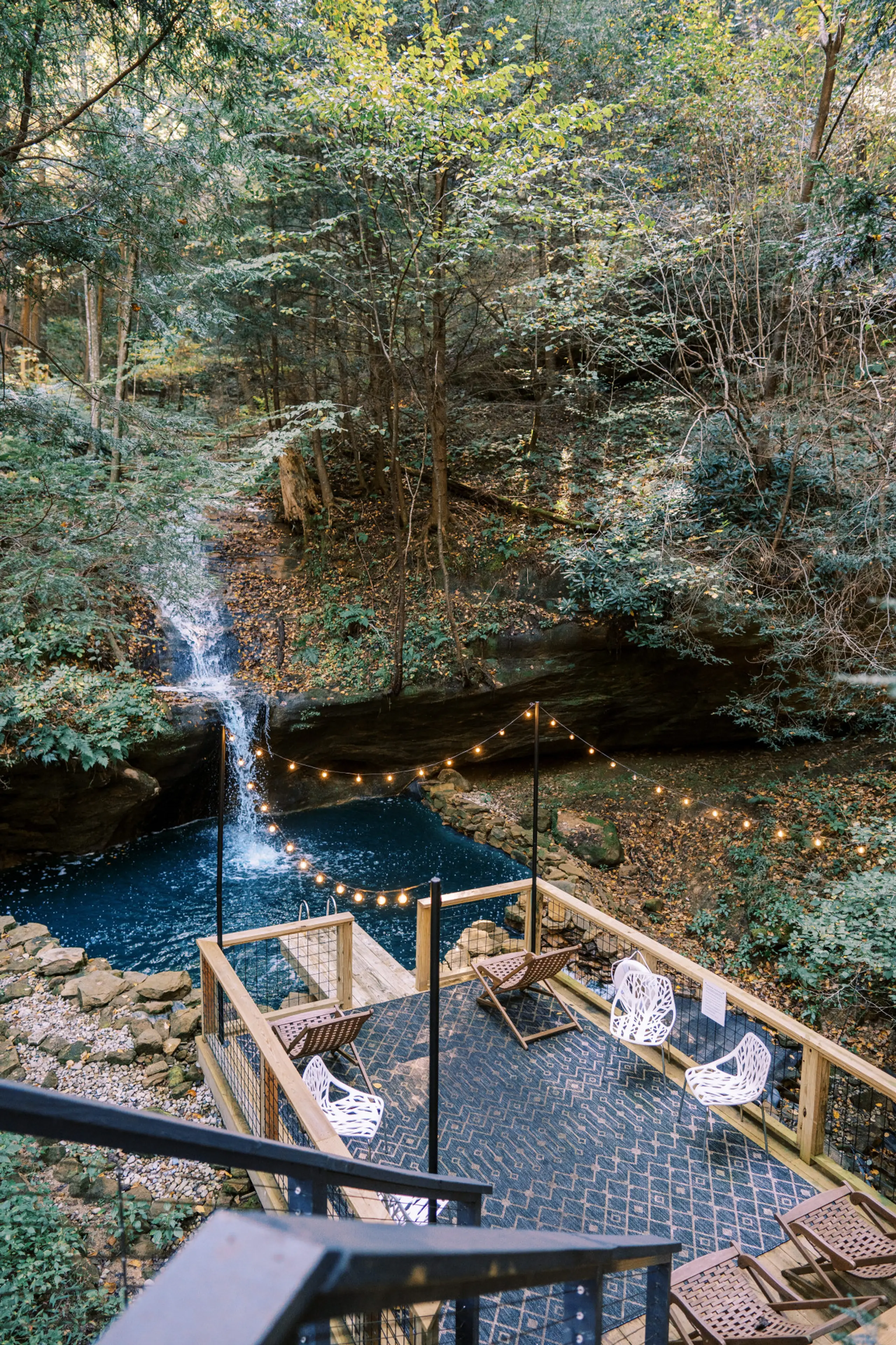 The property sits in Hocking Hills, where a seasonal waterfall runs right past the lodge and feeds a swimming hole open from May through October. Rock faces wait just a five-minute hike away. The landscape here is all sandstone cliffs, hemlock ravines, and the kind of quiet that settles in once you leave the main roads behind.