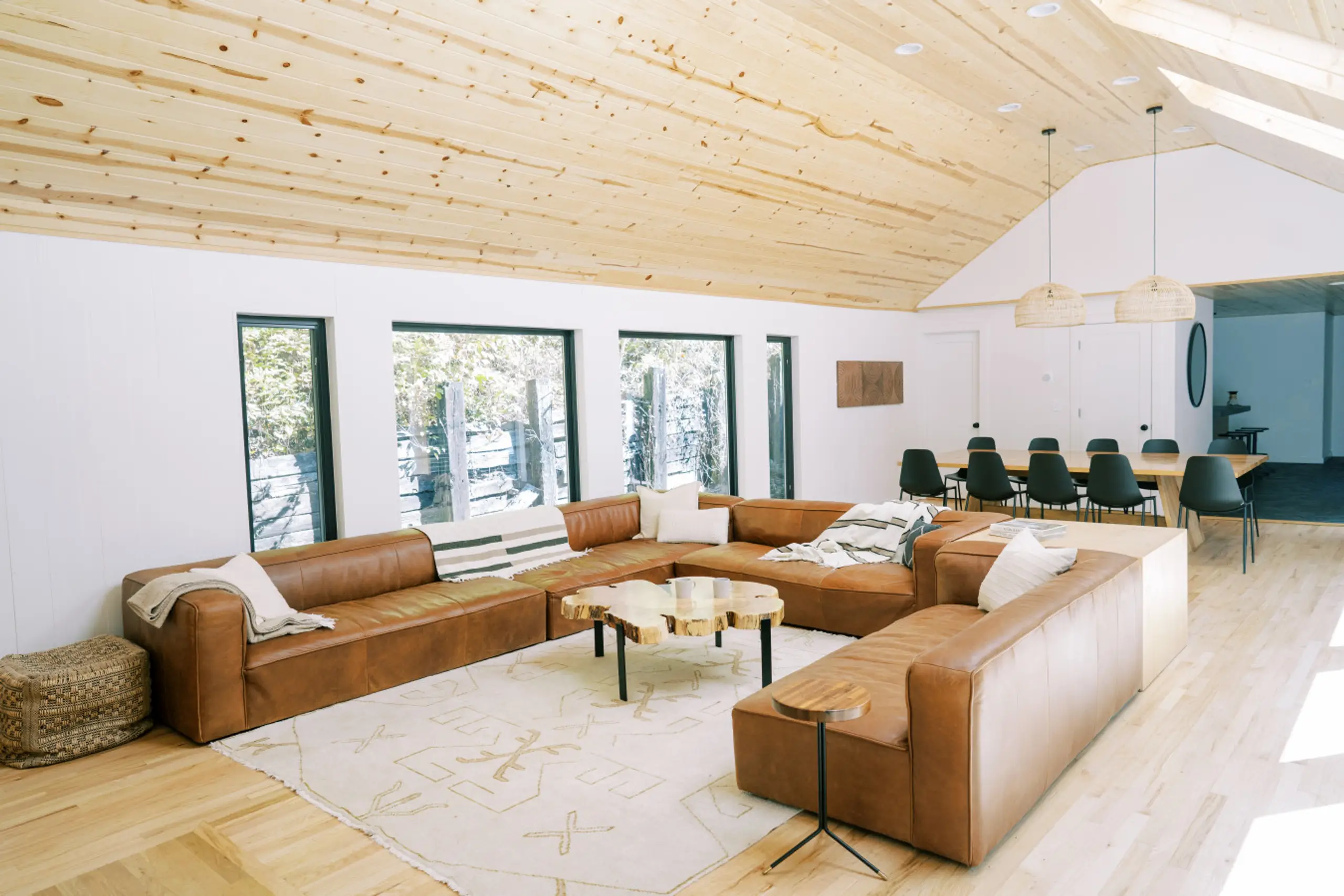 Days here tend to split between active and restful. Mornings might start with coffee on the expansive deck before a short hike to explore the rock formations. Afternoons could mean swimming in the natural pool or tournament-style competitions in the game room. Evenings often migrate to the eight-person hot tub or gather around the Solo stove, letting conversation drift until someone suggests one more game of cornhole. The space works for groups who want options without having to leave the property.