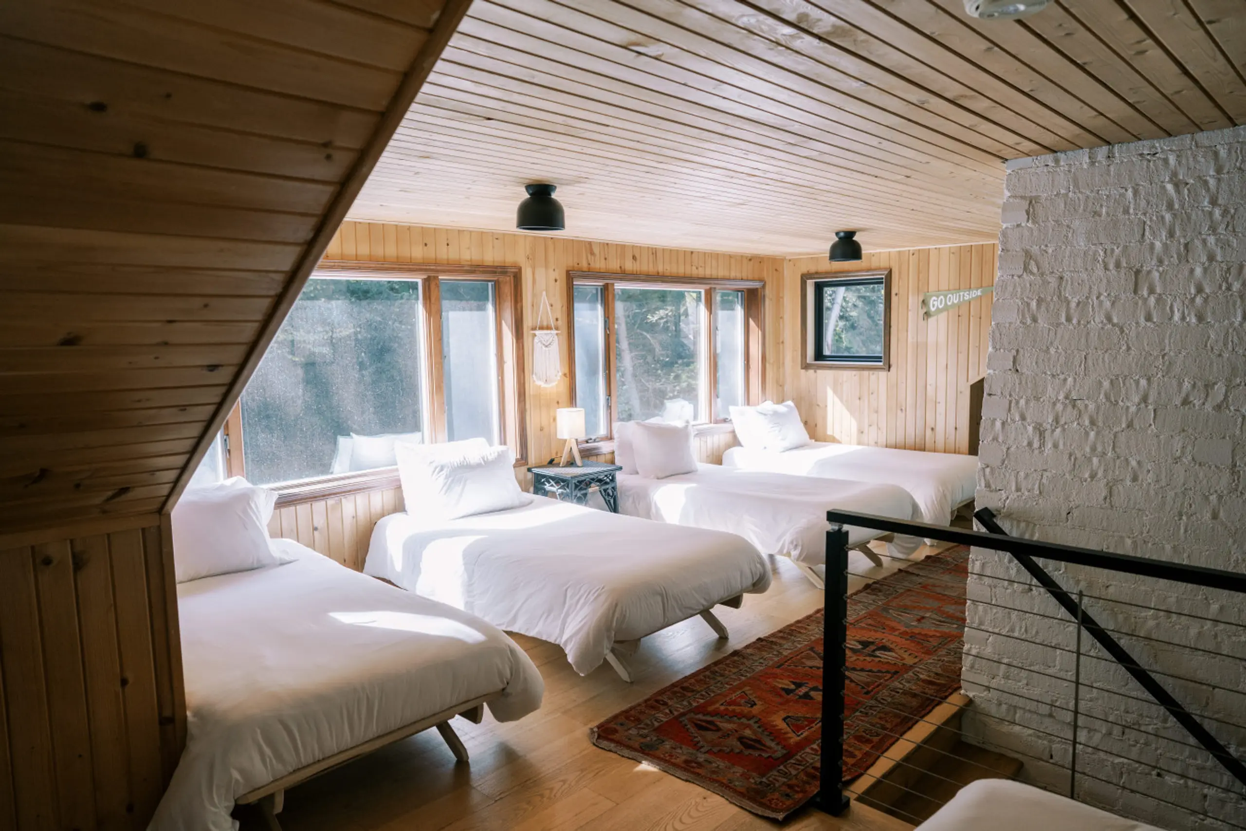 This six-bedroom lodge spreads across multiple levels, each designed for a different kind of togetherness. The main living room centers around comfortable seating with a dining table that converts to ping pong when the mood shifts. A trap door near the end table leads down to the game room below, where air hockey, arcade games, and foosball keep the energy going. On the other side of the kitchen, a quieter den offers cozy seating for smaller conversations or morning coffee. The kitchen handles groups well with a double oven, gas stovetop, two dishwashers, and a dedicated coffee cabinet. Among the six bedrooms, the Waterfall Room stands out with its queen bed positioned to take in views of nature and the sound of falling water. A sleeping loft adds flexibility for the full eighteen-guest capacity.
