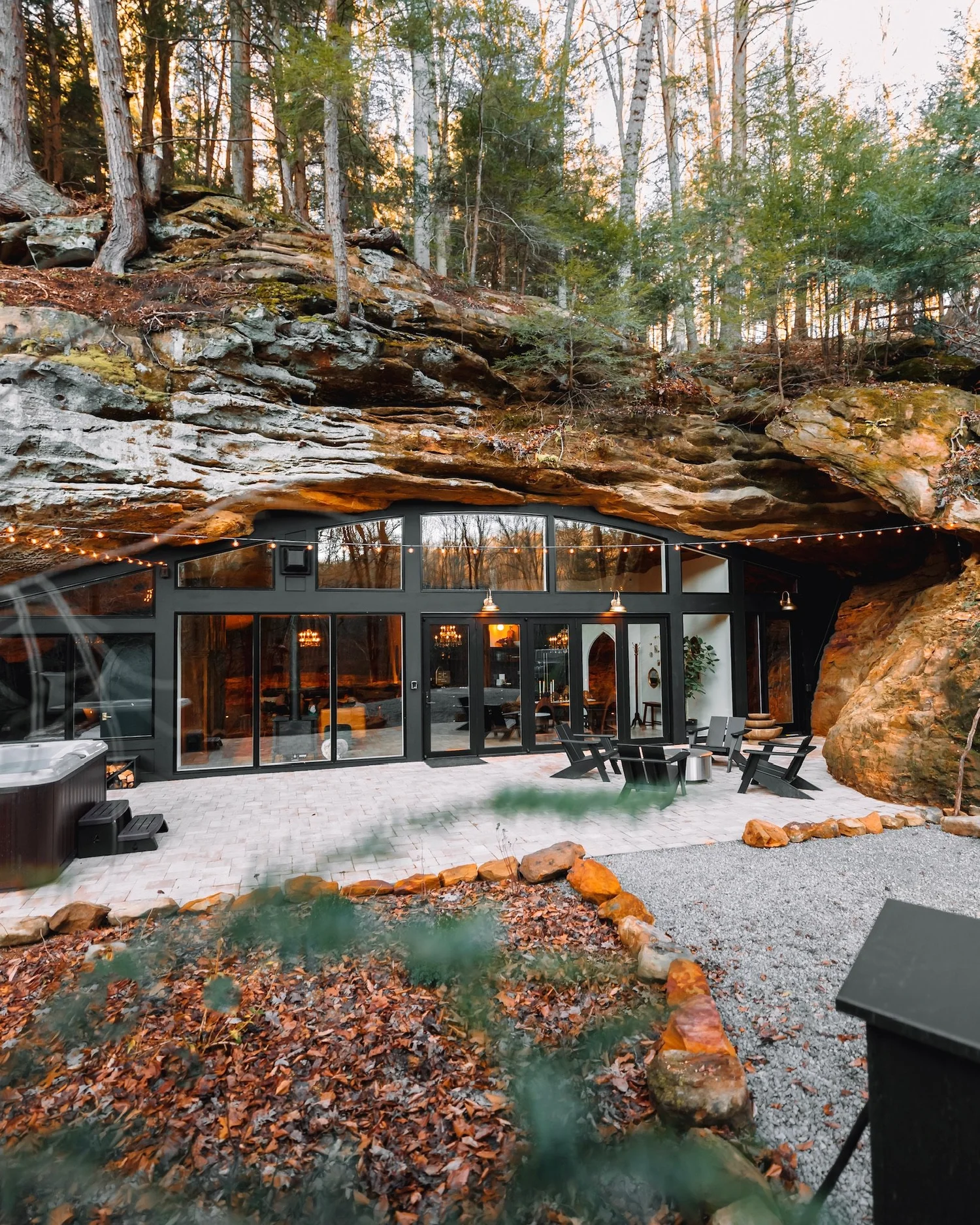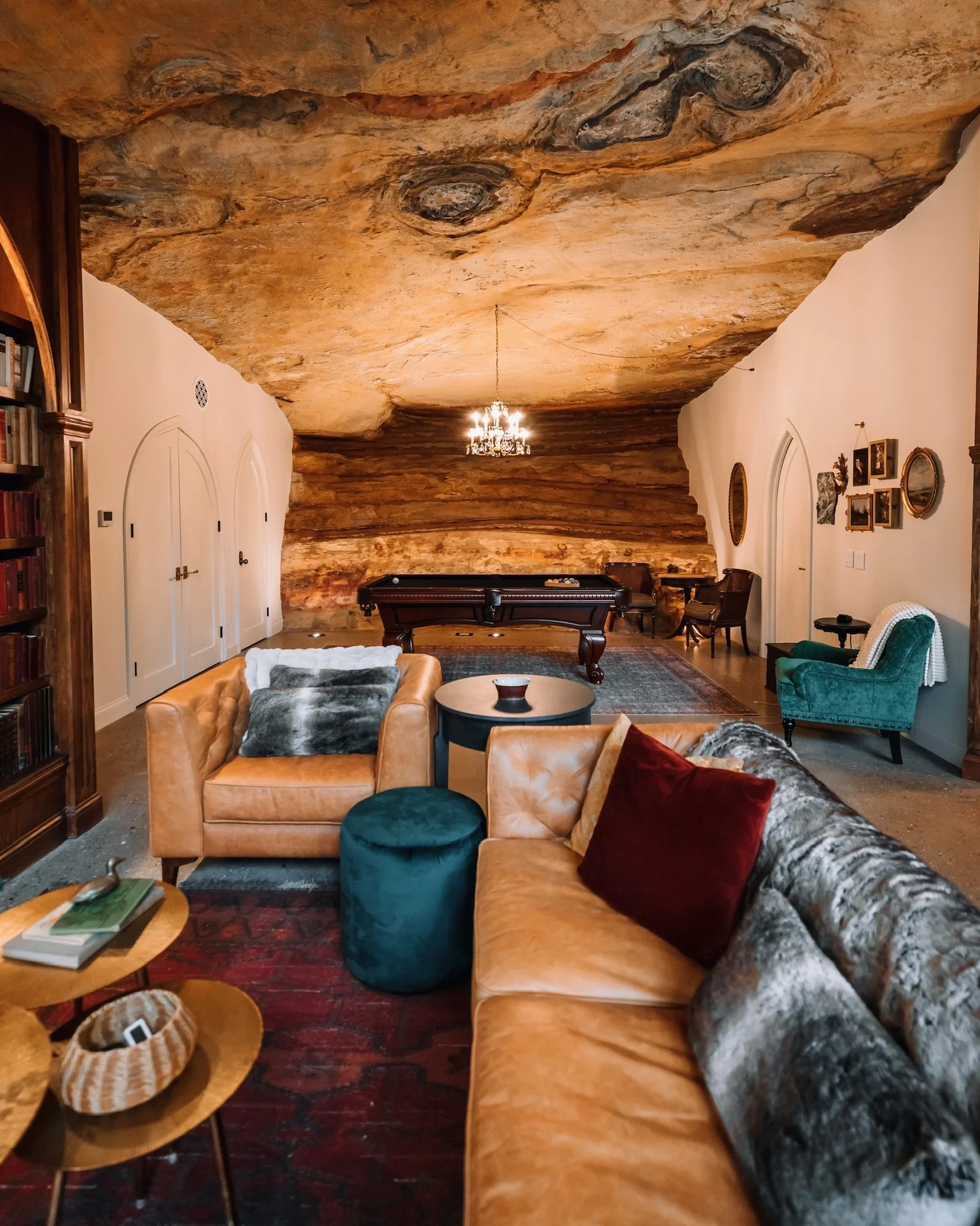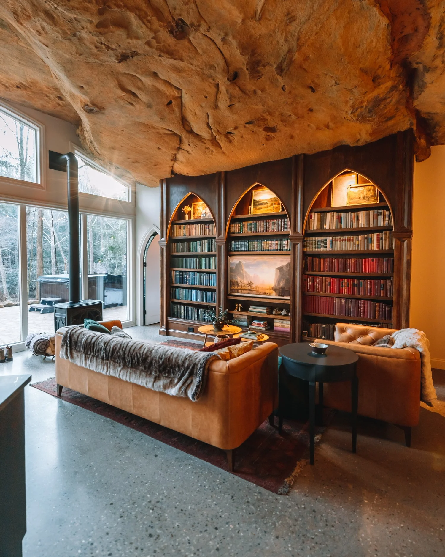 Days here might start slow, morning light filtering through windows that seem improbable given the stone surroundings. Afternoons could mean hiking the private trails or simply settling into a long game of pool while rain patters somewhere above. Evenings tend to migrate outdoors, the fireplace casting warmth as the hot tub steams in the cooling air. It's a place that rewards curiosity about how humans and landscape can fit together, where the unusual setting shifts attention away from the ordinary and toward something worth remembering.