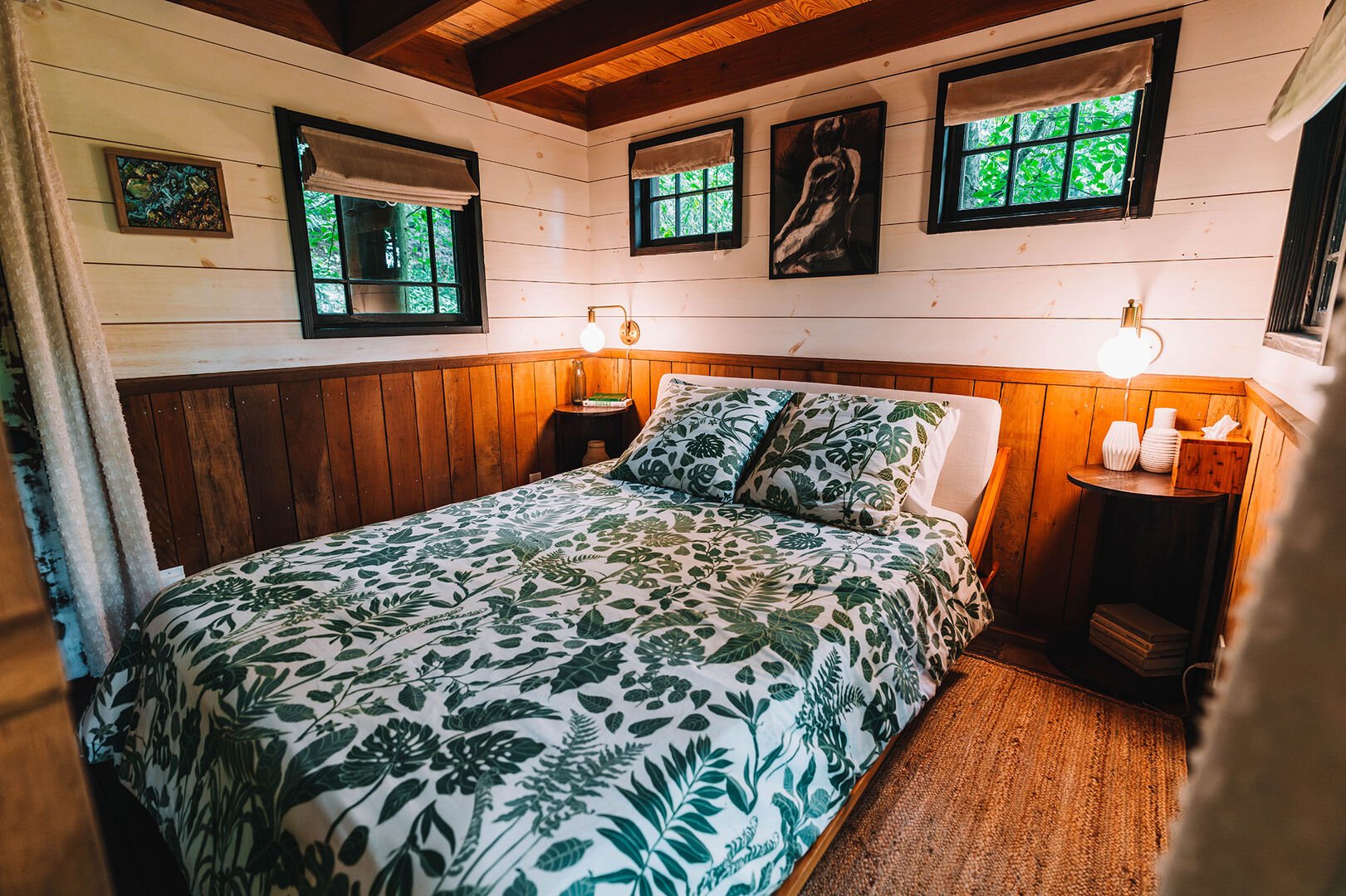 This treehouse holds more refinement than most expect from a structure built among branches. The main living area centers on a cozy sofa and table, with a kitchenette equipped with sink, microwave, and refrigerator stocked with complimentary drinks. A queen bed occupies the main level, while a loft with two twin beds offers additional sleeping space above. The bathroom is the unexpected centerpiece. Heated floors warm your feet while a walk-in shower with five showerheads and digital temperature control turns bathing into something closer to ritual. A live tree grows through the space, enclosed in glass, bringing the forest inside in a way that feels both surreal and grounding. Two private decks extend the living space into the canopy, offering places to sit with morning coffee or evening wine from the complimentary selection. Below, a fire pit waits on the forest floor with seasoned wood and kindling ready to go.