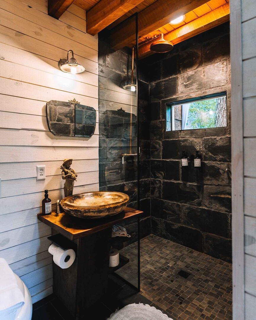This treehouse draws on memories of barn lofts and blanket forts, built with rough sawn barnwood oak, reclaimed tin ceilings, and quilt curtains that soften the light. The main level holds two rocking chairs facing a wall of reclaimed windows, with a leather sofa that converts to a queen memory foam bed. A kitchenette features a hammered copper sink set into black walnut countertop, stocked with pour-over coffee supplies, a water boiler, and locally made granola bars. A mini fridge keeps filtered and sparkling water cold, and a microwave handles simple meals. The loft bedroom feels like a grown-up blanket fort, with a carved oak queen bed, large skylights overhead, and a working 1900s phonograph for setting the mood. An antique quilt hangs as a privacy curtain, enclosing the space when drawn. The bathroom carries the same handcrafted sensibility: a moss-covered birdbath sink, exposed copper plumbing feeding a rain shower, and locally made rosemary mint toiletries. Outside, a soaking tub tucks into a nook of the wraparound deck, with a patio table seating four. Below the treehouse, a smokeless fire pit comes stocked with wood, charcoal, and s'more supplies.
