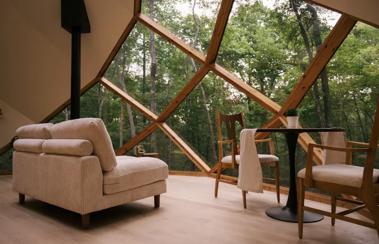 The zome draws its form from mountain laurel blossoms and pinecone spirals, creating a single room where geometry does something unexpected to the light. Faceted windows and skylights let morning pour in from multiple angles, filling the space in ways that shift as the sun moves. A wood stove anchors the ritual of evening, the kind of simple task that settles the body before sleep. The bed waits under that angled ceiling, downy and warm. Outside, a Koto Elements spa tub offers another way to close the day, water and woodsmoke and whatever the sky is doing.